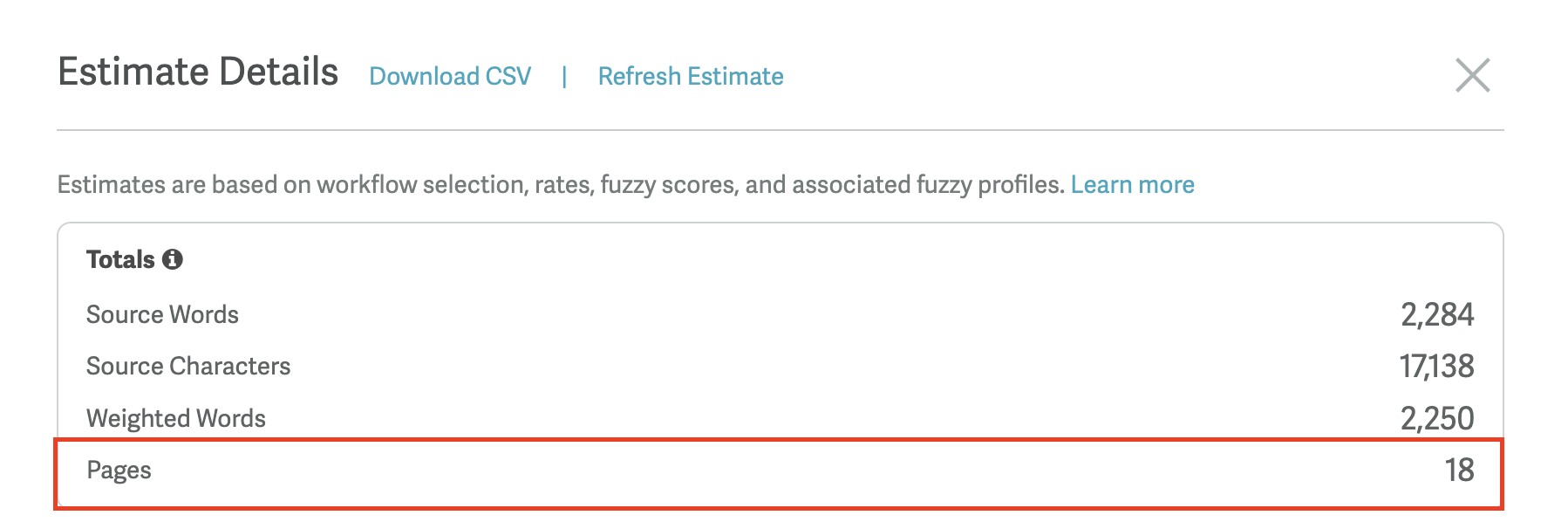 When exporting a fuzzy estimate in a CSV format, the estimated page count for DTP will only be included if the export is performed while the content is in the Desktop Publishing step of the workflow. If the estimate is exported while the content is in any other step of the workflow, it will not contain the estimated page count.
