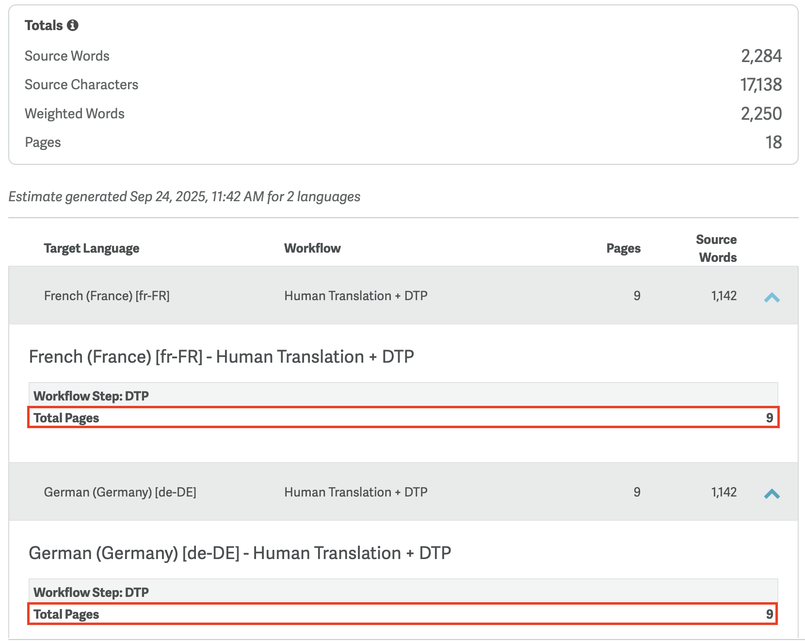 Expand the estimate details for each target locale to view the estimated page count per locale and workflow.