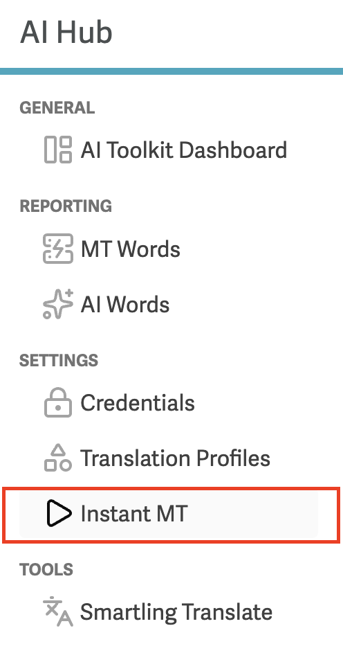 - From the top navigation bar of your Smartling dashboard, access the AI Hub.