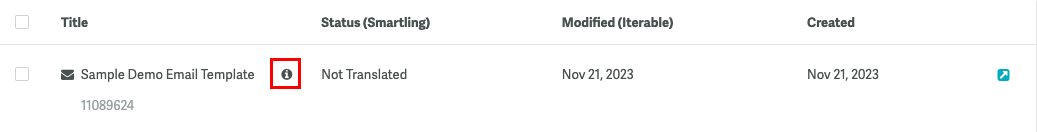 2) In the Iterable tab of your Smartling project, click the information icon of an asset > Request Translation. This option allows you to request translation for only that individual asset.
