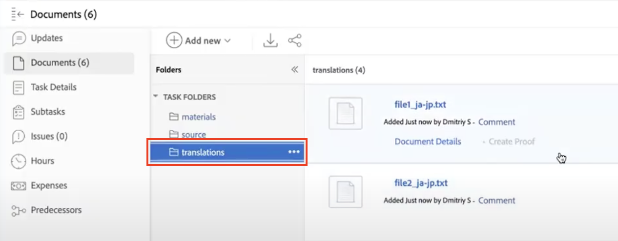 In the "Documents" list of the same project or task that was used to initiate the translation request, a "translations" folder is created automatically by the Smartling connector. As soon as a file is fully translated and completed for one of the requested languages, the translated file is downloaded automatically to this "translations" folder.