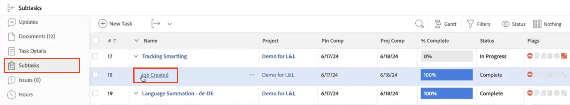 When a translation request is initiated, the Smartling connector automatically creates subtasks in Workfront to keep track of all events related to the translation of your files.