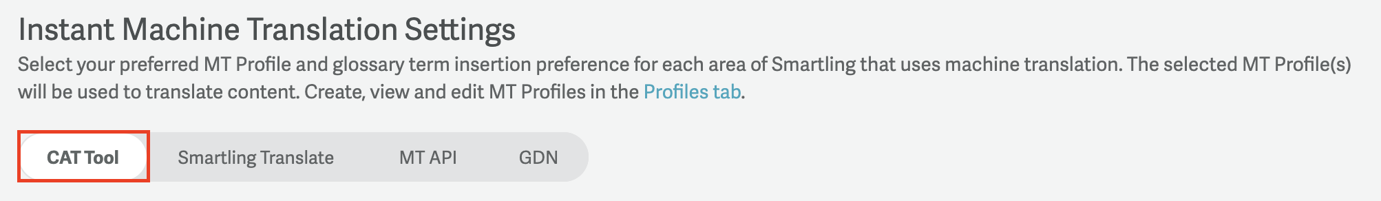- MT Profiles can be used to translate content with Smartling's MT API or one of Smartling's MT integrations, which provide machine translations directly where they should be displayed - without the need to upload the content into the Smartling platform first.