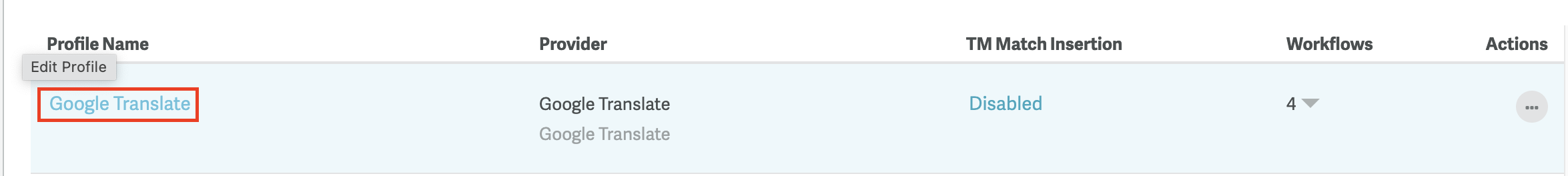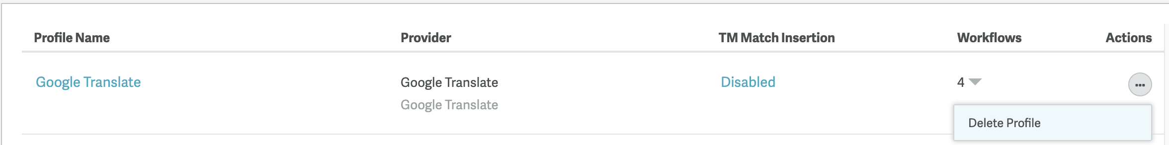 You cannot delete an MT Profile that is assigned to a workflow. You need to re-assign the workflow step to another translation option. If you unassign an MT Profile while translations are in progress, translation progress will stop. The translations will remain in the translation step until the step is reassigned.