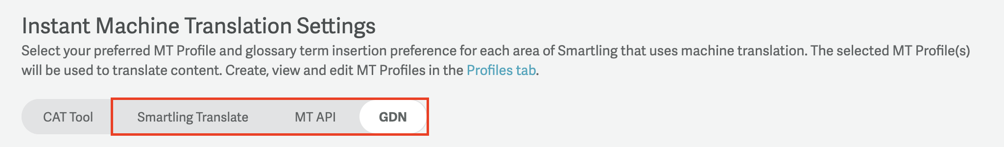 To select the desired MT Profile for each of these integrations, please navigate to the Instant MT tab of the AI Hub. Then click into the relevant tab for your MT integration.