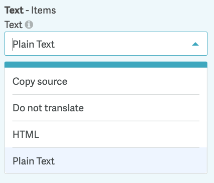 Content parsing refers to the process of breaking content into translatable strings. Content parsing settings are only available for Items relevant to the templates you selected in the Translatable Templates configuration. Use the drop-down menu to select how each field should be parsed.