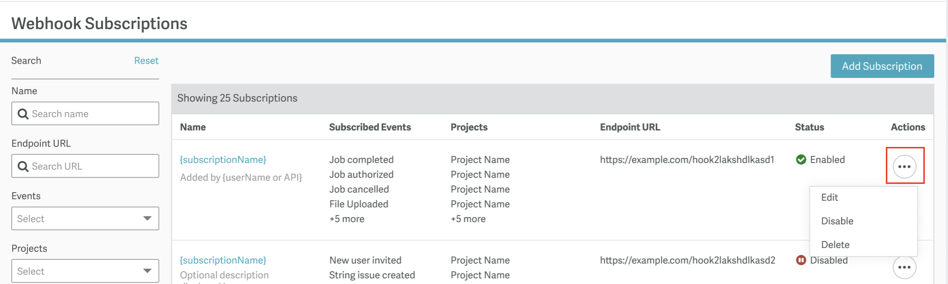 - Actions: Click on the ellipsis to manage the subscription: Edit, enable, disable or delete the subscription.