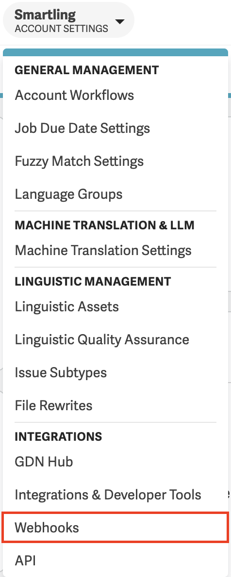 Webhooks can be configured by Account Owners and Project Managers through the Webhook Subscriptions List in the Smartling dashboard.
