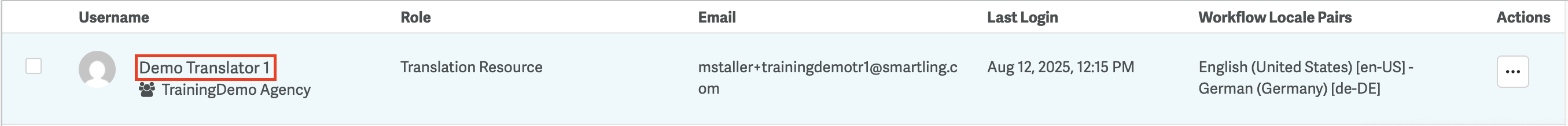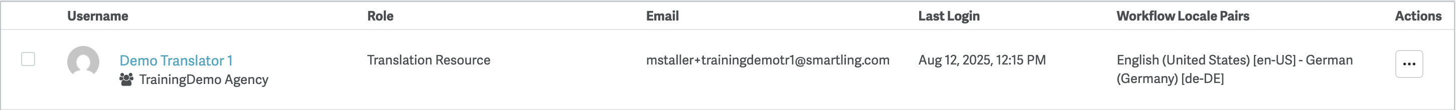 From the Users tab, you can view and manage all active users in your Smartling team. The list displays the following information: