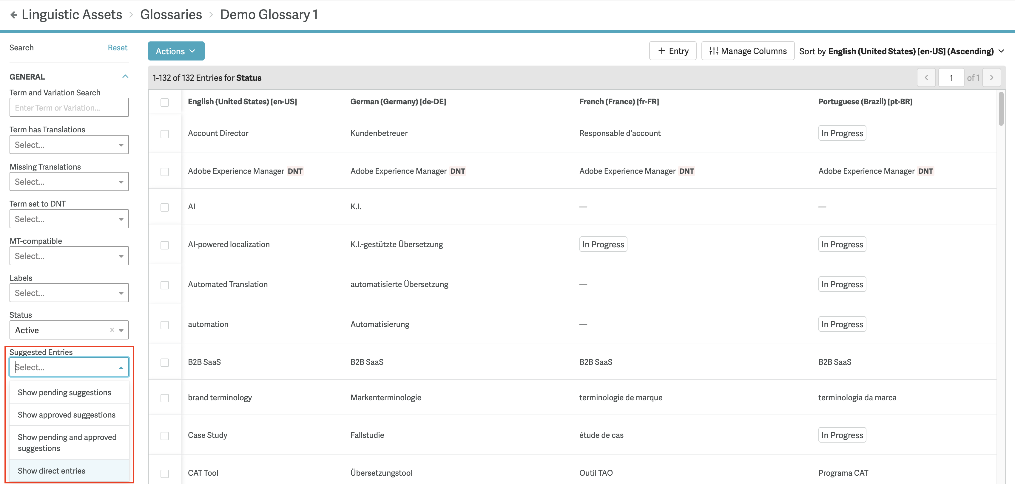 - Show pending and approved suggestions: This option displays all glossary entry suggestions, regardless of whether they have been approved or not.