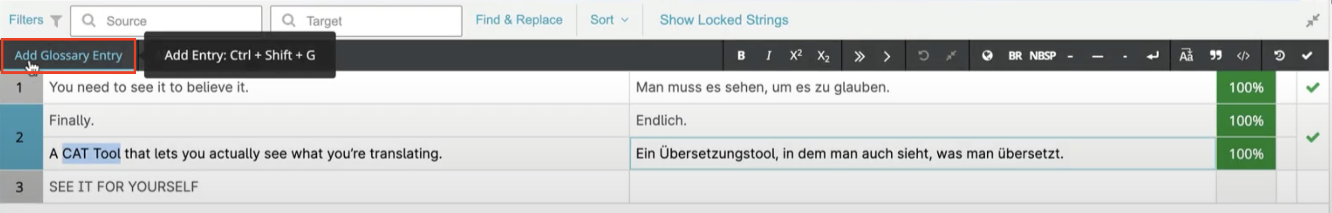 - Click "Add Glossary Entry" from the toolbar, or use the keyboard shortcut to "Add Glossary Entry".