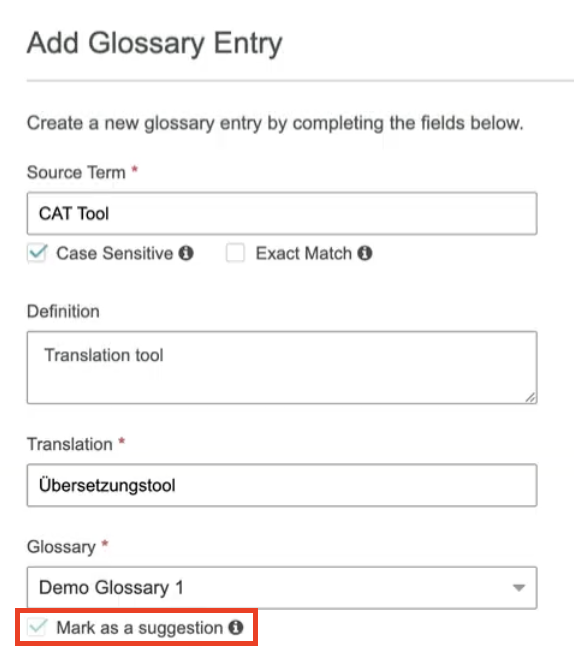 Info: The translation of an entry can only be requested once the suggestion has been approved and is part of the active glossary.