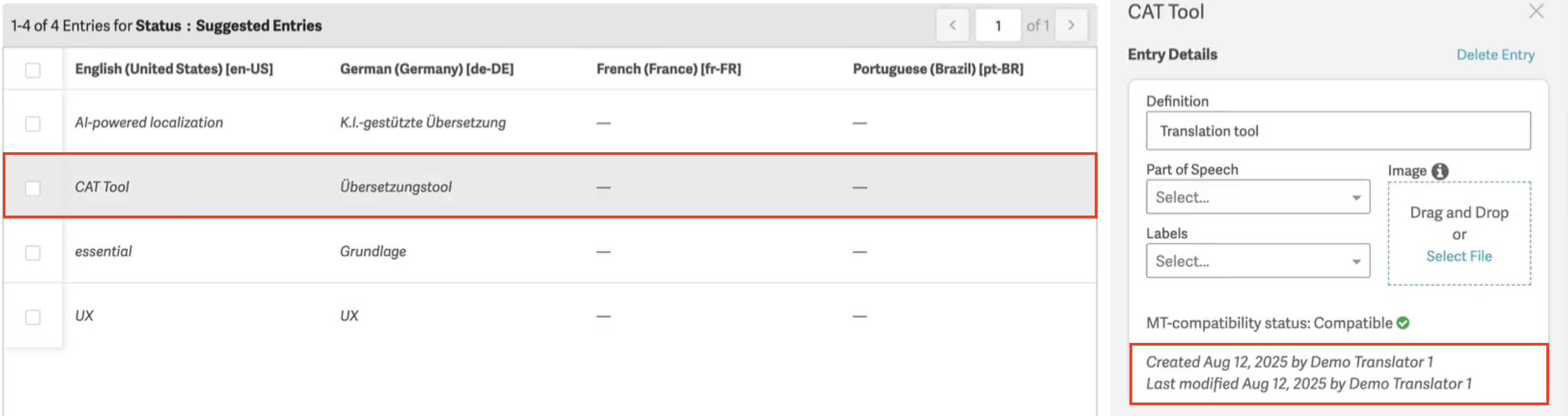Once approved, the entry is now part of your active glossary. The approved entry is now visible to human linguists, and, once confirmed, MT-compatible entries can be used for Glossary Term Insertion in machine and LLM translations.