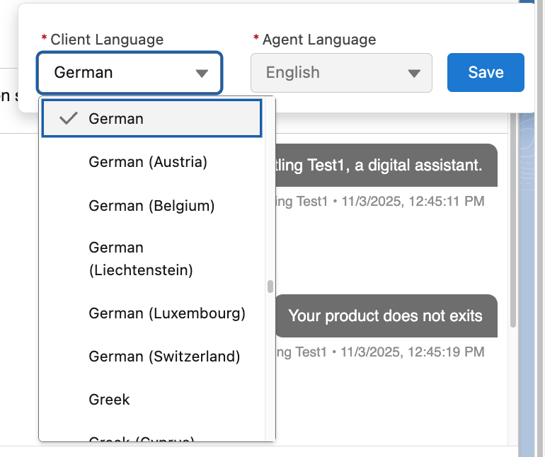 The connector automatically detects the client language based on the customer’s initial message or the language set in their Salesforce profile. However, agents can manually change the client language if the profile language is incorrect or if there is an issue with language detection.