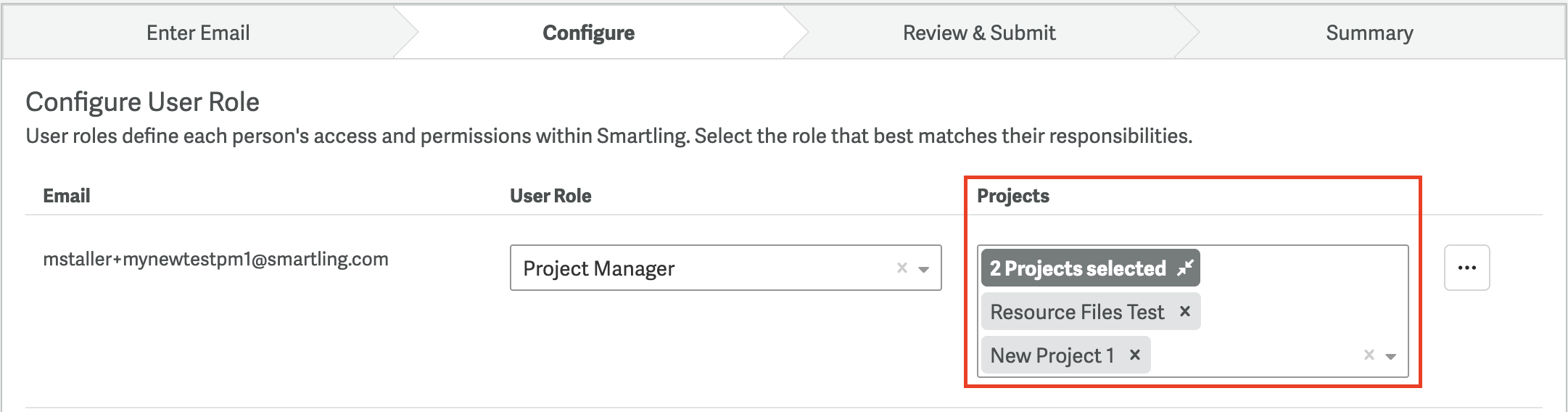 For project-based roles (Project Manager, Requester or Content Viewer), use the Projects dropdown menu to select which project(s) the user should have access to.