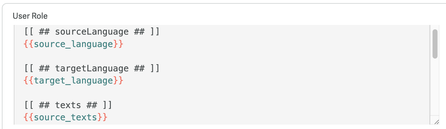 If you would like to include placeholders in your User Role prompt, apply the Jinja2 placeholder format delimited by double curly brackets. This placeholder format is also used in Smartling’s default User Role message.