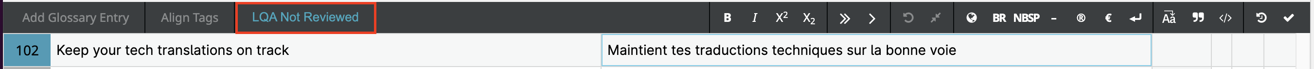 - If the translation has not been LQA reviewed, the toolbar says "LQA Not Reviewed" and no counter is displayed in the column underneath the checkmark symbol.