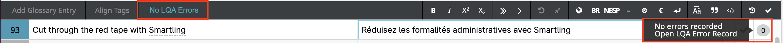 - If the translation has been reviewed and marked as containing "no errors", the toolbar will say "No LQA Errors" and the counter in the right column displays the greyed-out number zero (0).